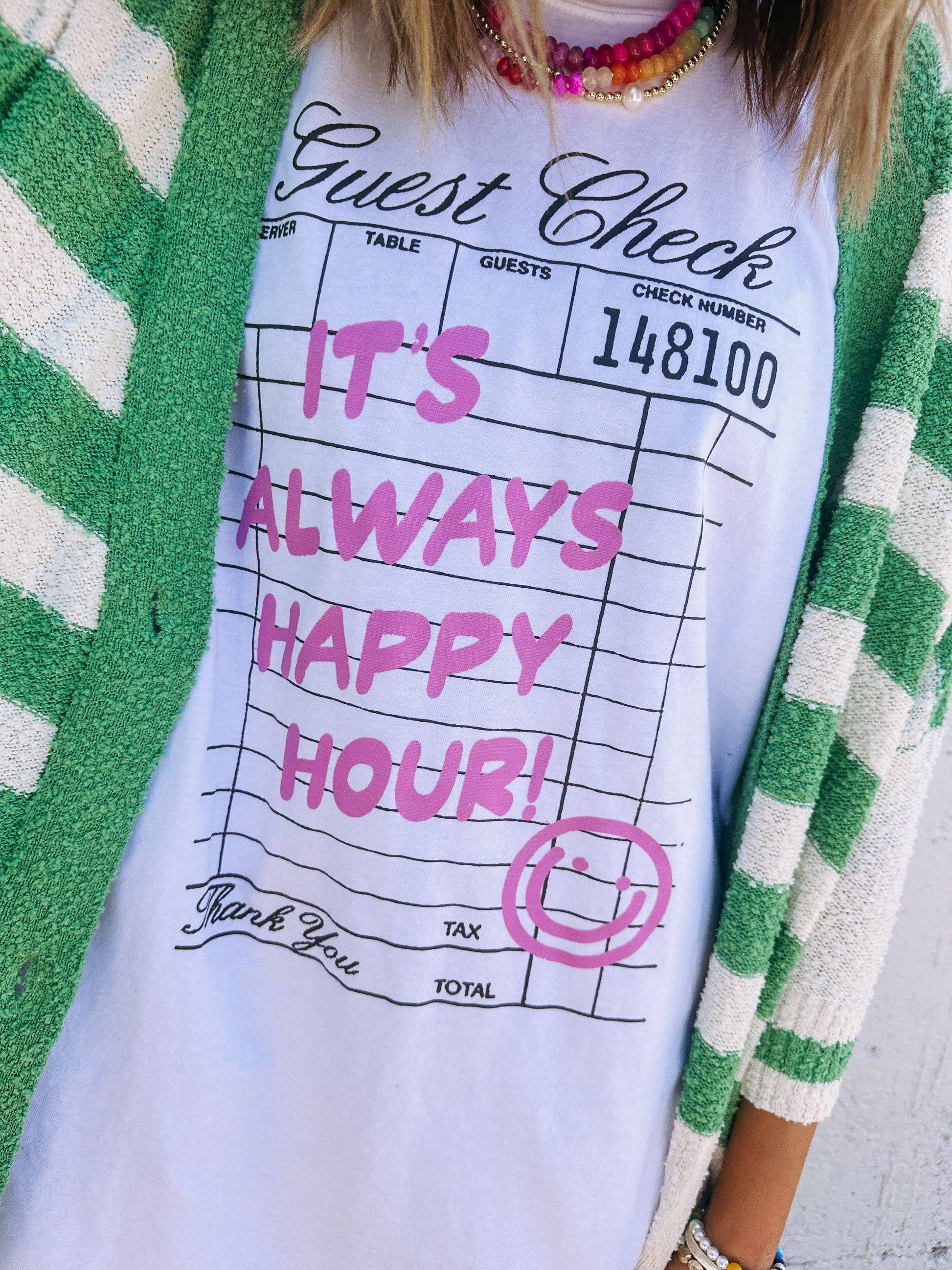This tee features a unisex fit and the phrase "It's always happy hour" written on a guest check. Made with 100% cotton, it's recommended to size up for an oversized fit.