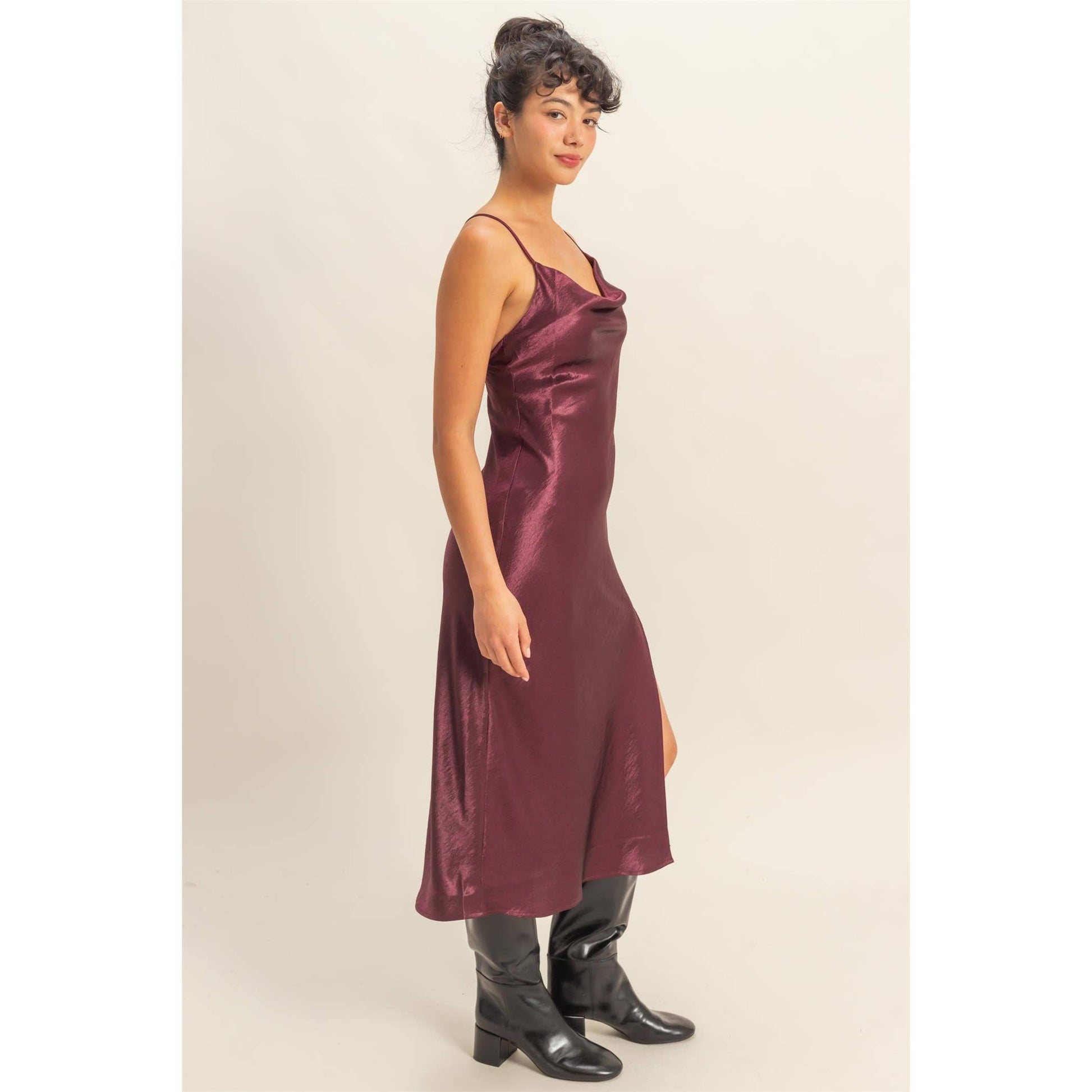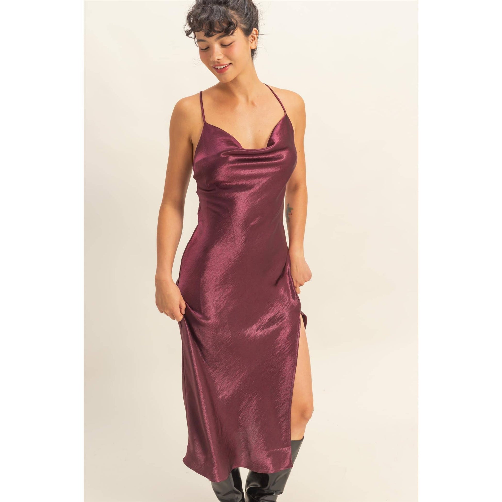 This Versatile Satin Dress Is The Epitome Of Perfection And Features A Cowl Neck, Supported By Thin Shoulder Straps That Crisscross At Back. A Fitted Bodice Continues Down Into A Flowy Skirt, Completed With A Skin Baring Low Back. 100% Polyester Model Is 5' 7" Tall, 32" Chest, 25" Waist, 36" Hips And Wearing A Size Small Imported. Designed in the USA