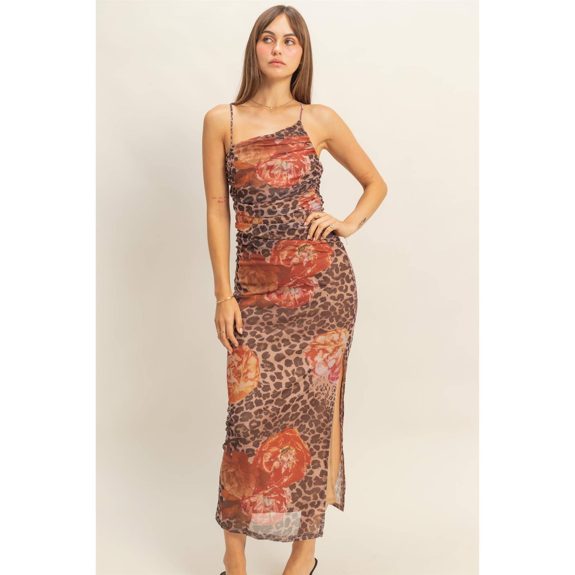 Embrace The Call Of The Wild And The Elegance Of Florals In One Striking Garment. This Sleeveless Midi Dress Marries Fierce Leopard Spots With Lush Floral Blooms In A Seamless Blend Of Nature-Inspired Prints. Crafted For A Figure-Skimming Silhouette, The Dress Features A Subtle Ruching At The Waist That Enhances Your Natural Curves, Making It Both Flattering And Comfortable For All-Day Wear. 95% Polyester 5% Spandex Model Is 5' 8" Tall, 30" Chest, 25" Waist, 35" Hips And Wearing A Size Small Imported. Designed in the USA