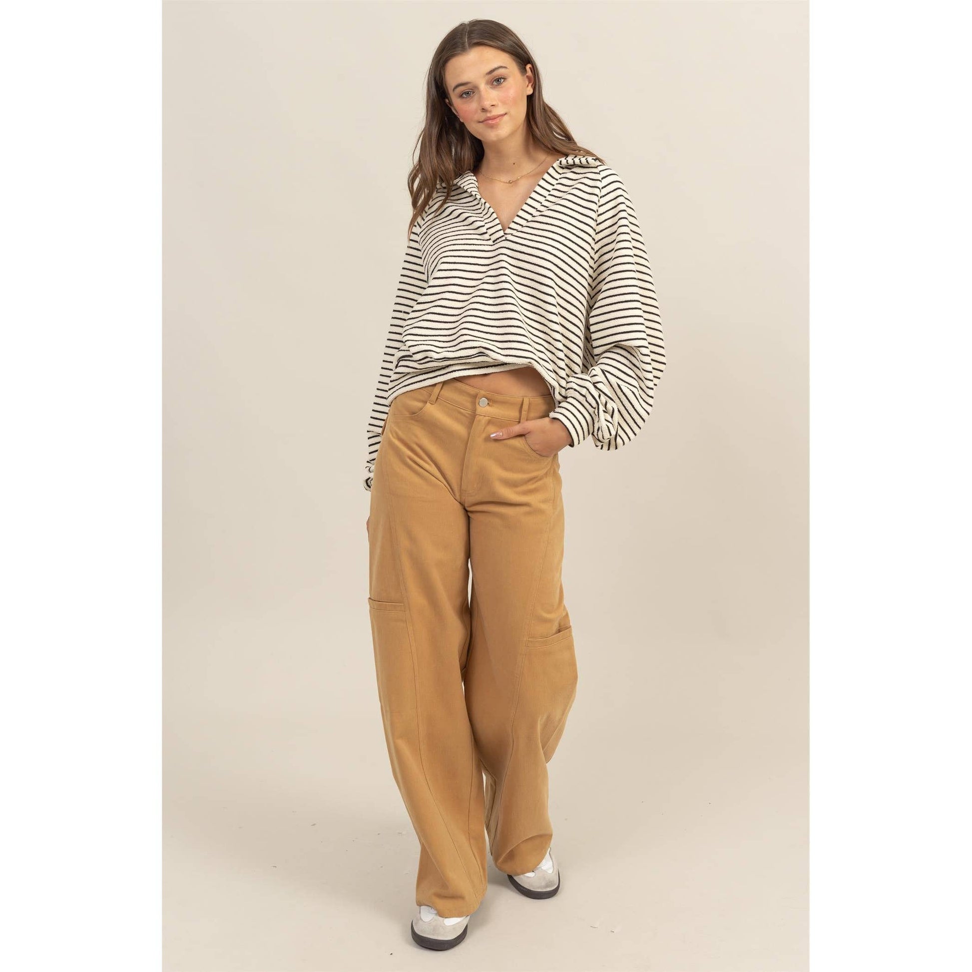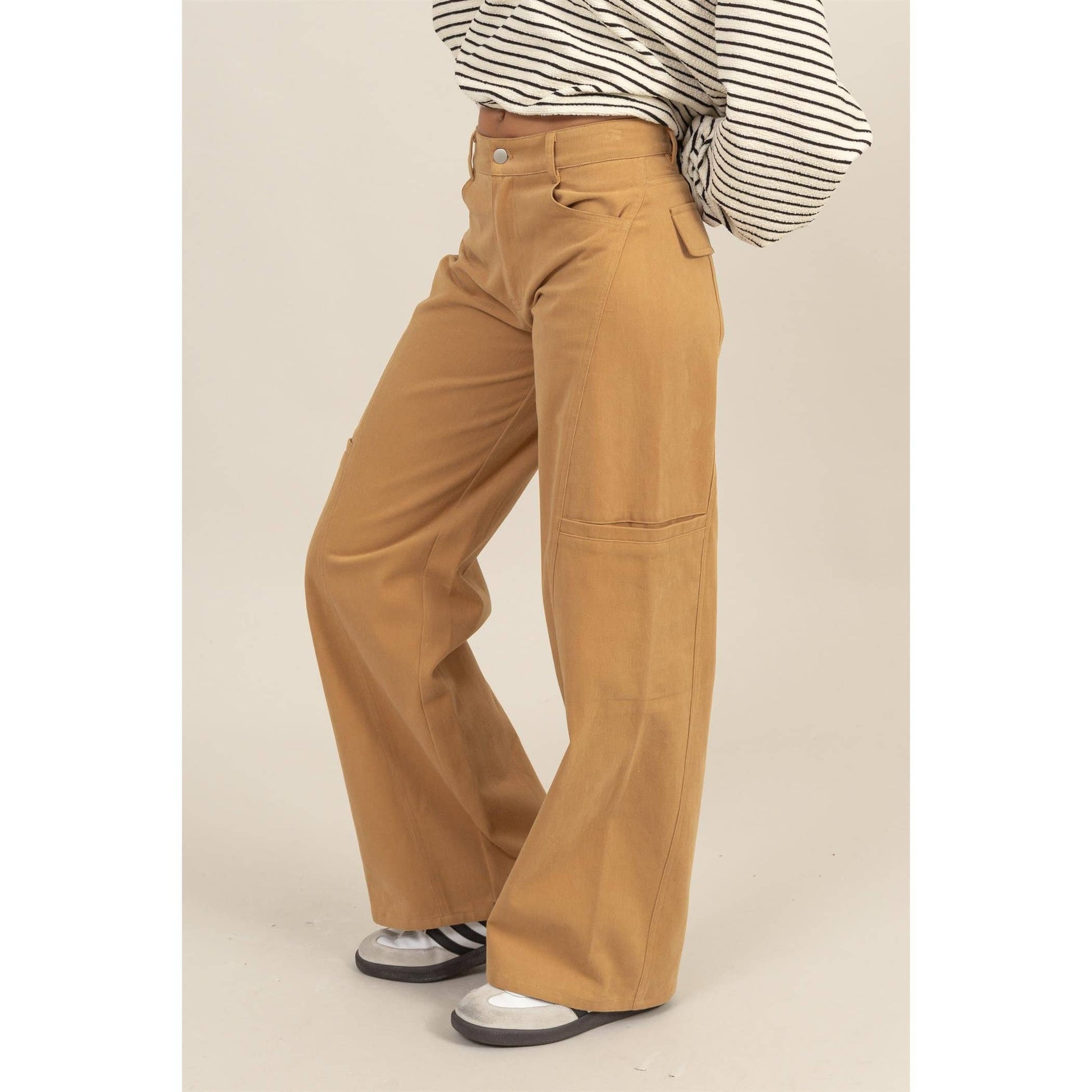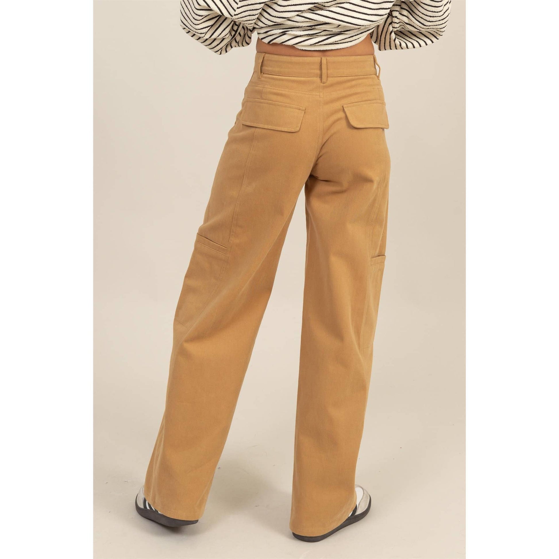 Crafted with a high-rise fit, these pants seamlessly combine style and functionality. The oversized patch pockets on the back add a utilitarian touch to the design. Made from durable and comfortable fabric, these pants provide ease of movement and long-lasting wear. Pair them with a striped top or a cozy sweater to achieve a chic, everyday look. Ideal for those who value a balance of fashion and practicality.