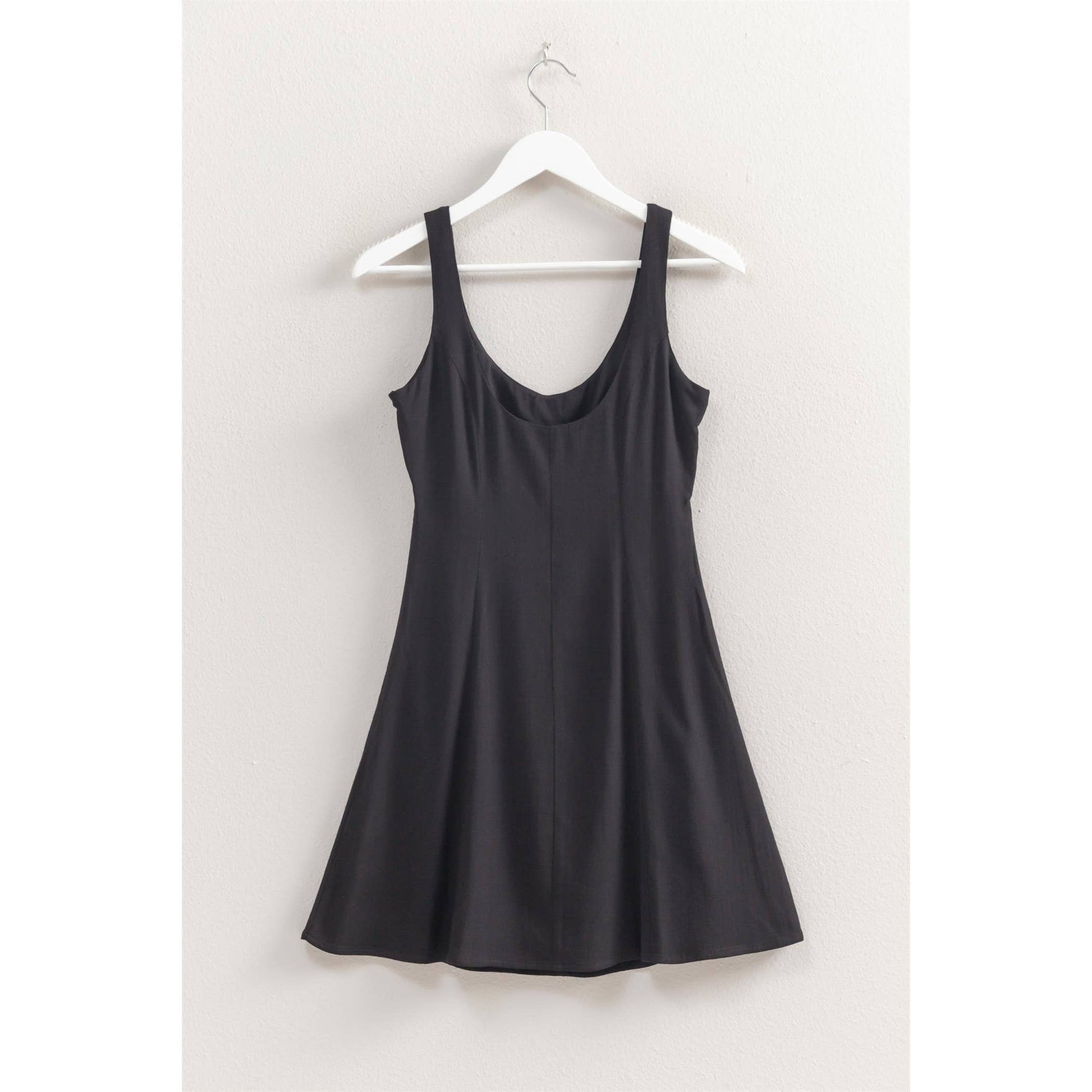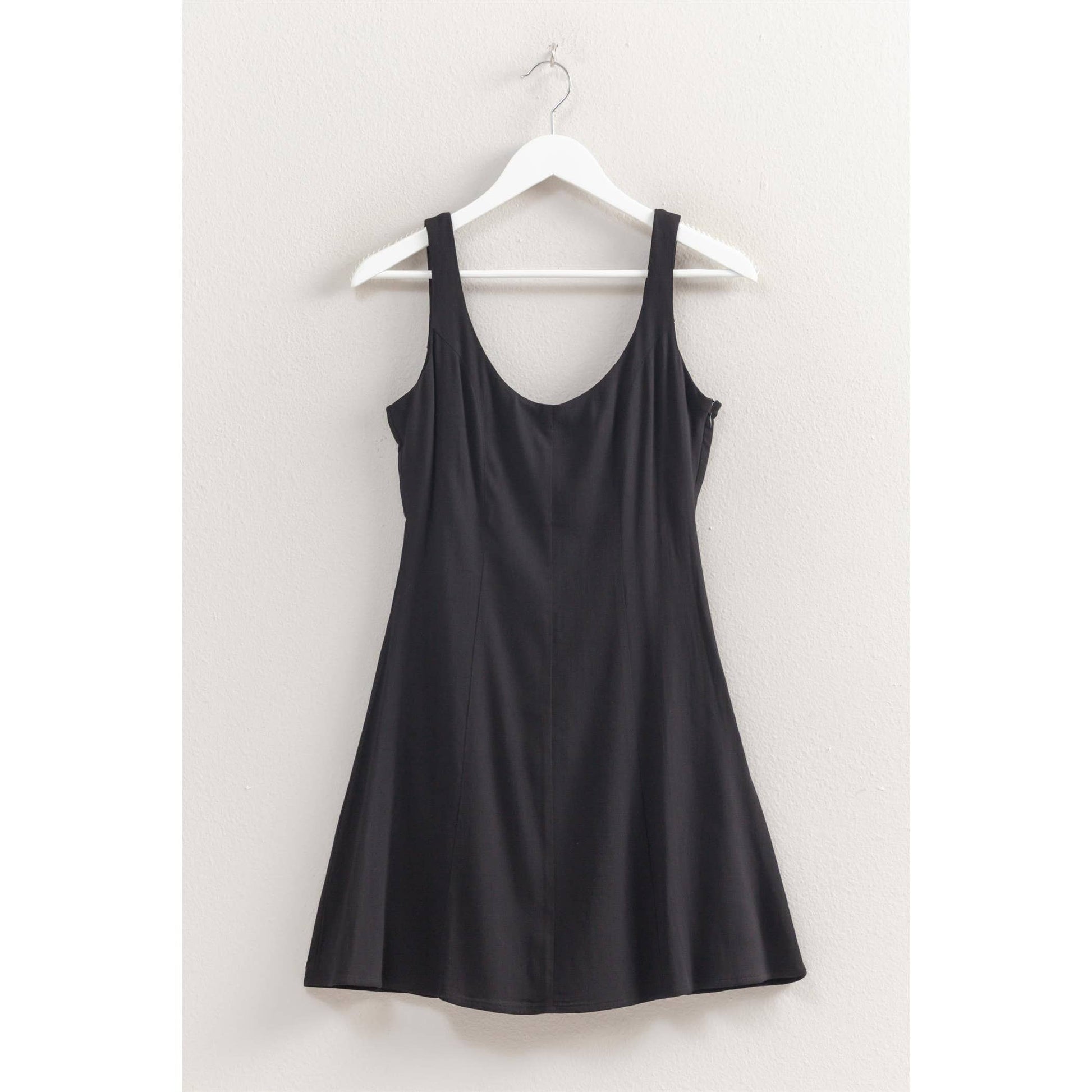 Enhance your next outdoor gathering with our Black Linen Mini Dress, perfect for summer. Featuring a scoop neckline and sleeveless design, this dress provides stretch and a flattering fit for your comfort. Available exclusively in black.
