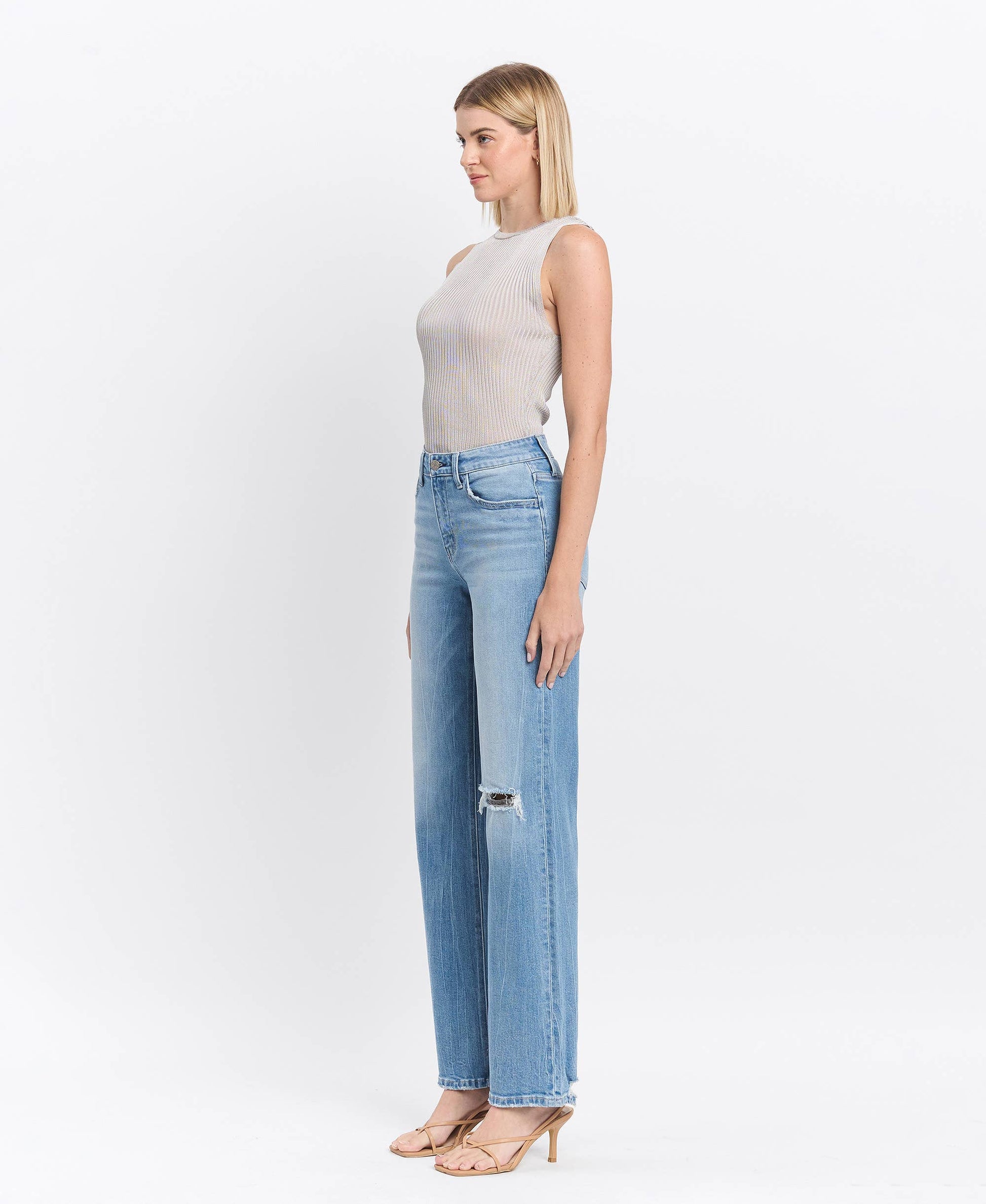 The Aileeah Slim Wide Denim features a high rise waist, distressed detail, and full length design for a sleek and comfortable fit. With a 10" front rise, 32" inseam, and 18" leg opening, these slim wide jeans are perfect for any body type. Our model, standing at 5'10", wears a size 26.
