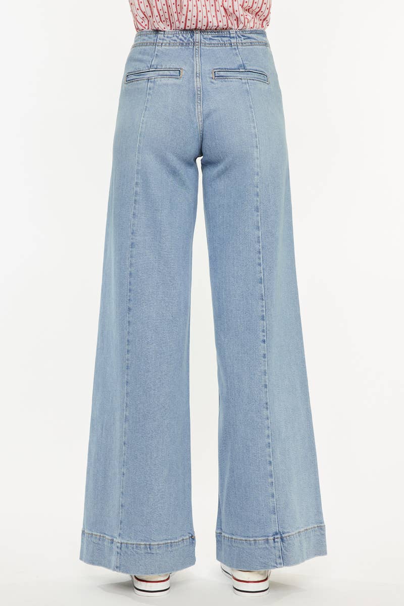 Expertly crafted with a light wash and a high rise, these denim pants feature a wide leg fit and a comfortable stretch. The 2" regular hem, zipper fly, and hook & eye closure provide a secure and stylish finish. Cut seam details at the front and back rise add subtle yet eye-catching accents. With an 11" rise and 32" inseam, these jeans offer both comfort and style.