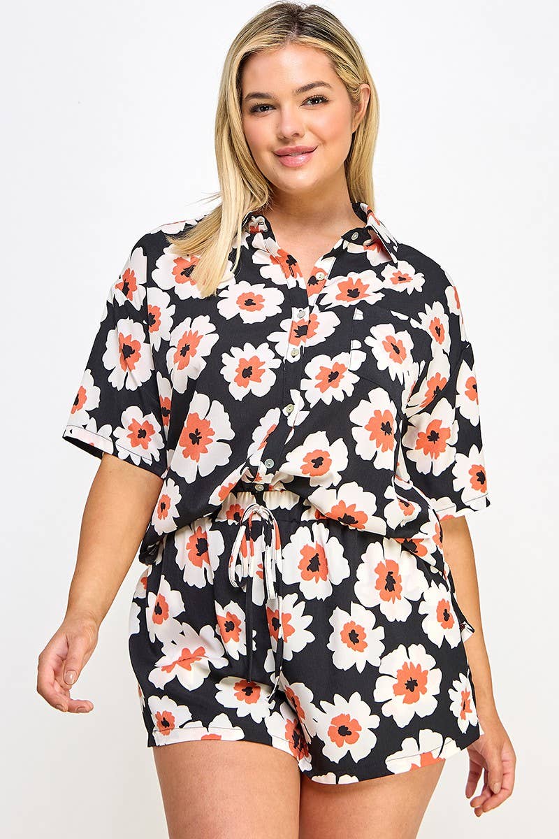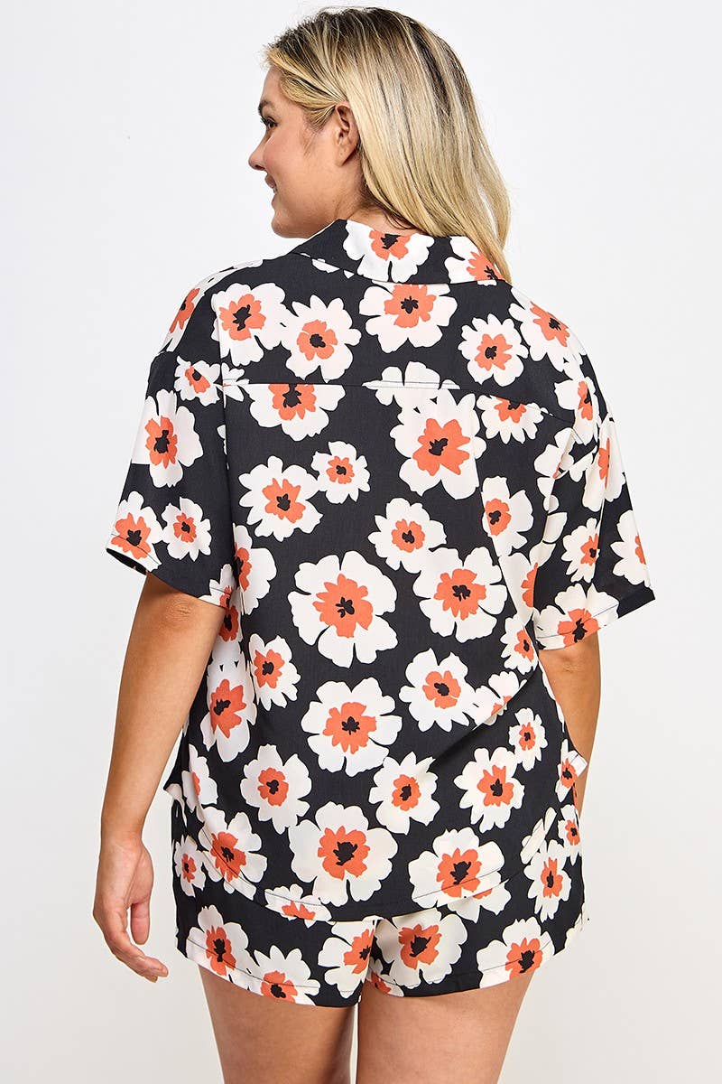 This curvy size set includes a button-down shirt with a shirt collar, short sleeves, a front pocket, and a relaxed fit, as well as elastic-waist shorts with a waist tie detail, pockets, and lining. The black floral pattern features white and pink flowers for a feminine touch.