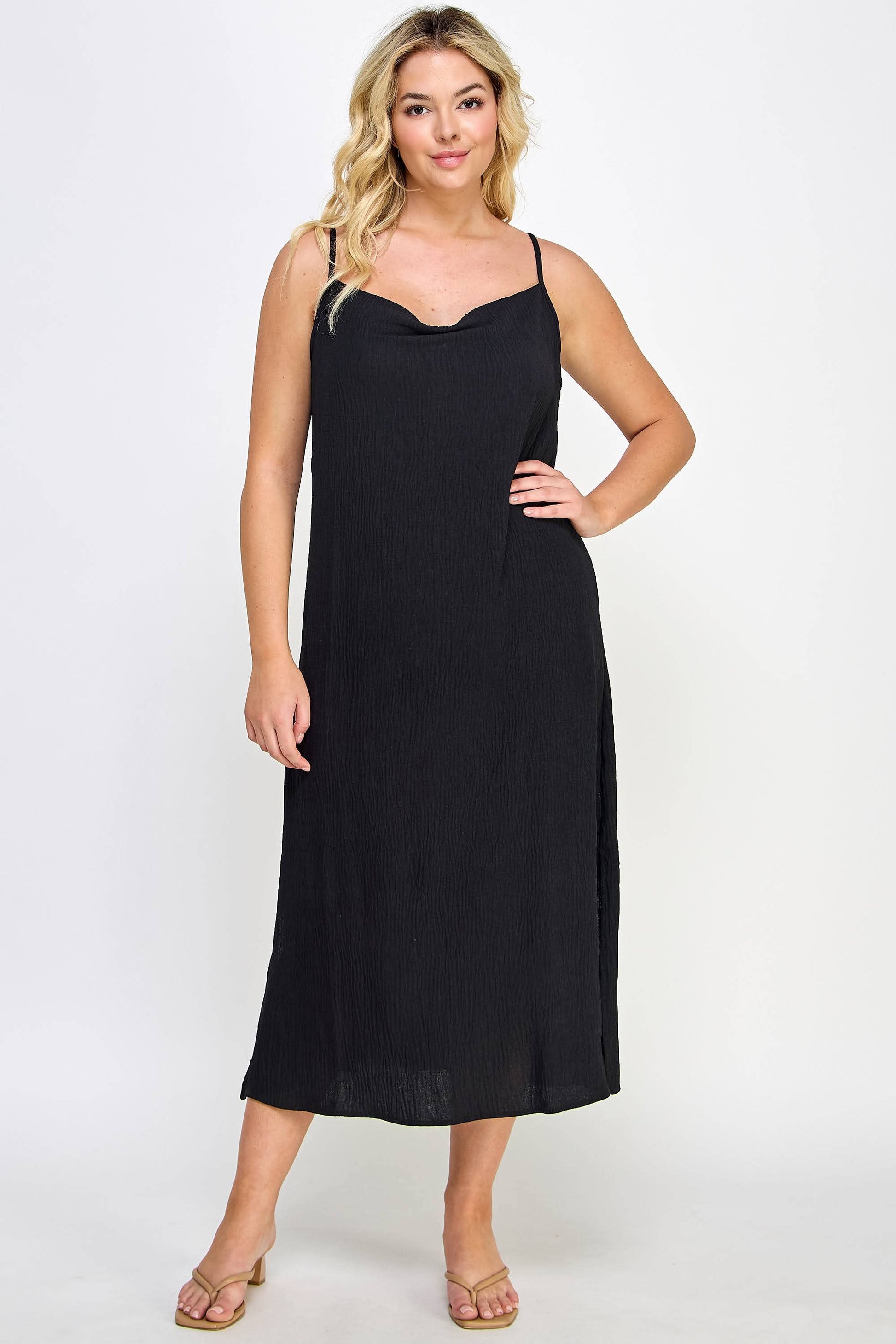 Expertly crafted for plus size figures, this elegant midi slip dress boasts a sophisticated solid color, a flattering draped cowl neck, adjustable straps for a personalized fit, and stylish side slits for added comfort and movement.