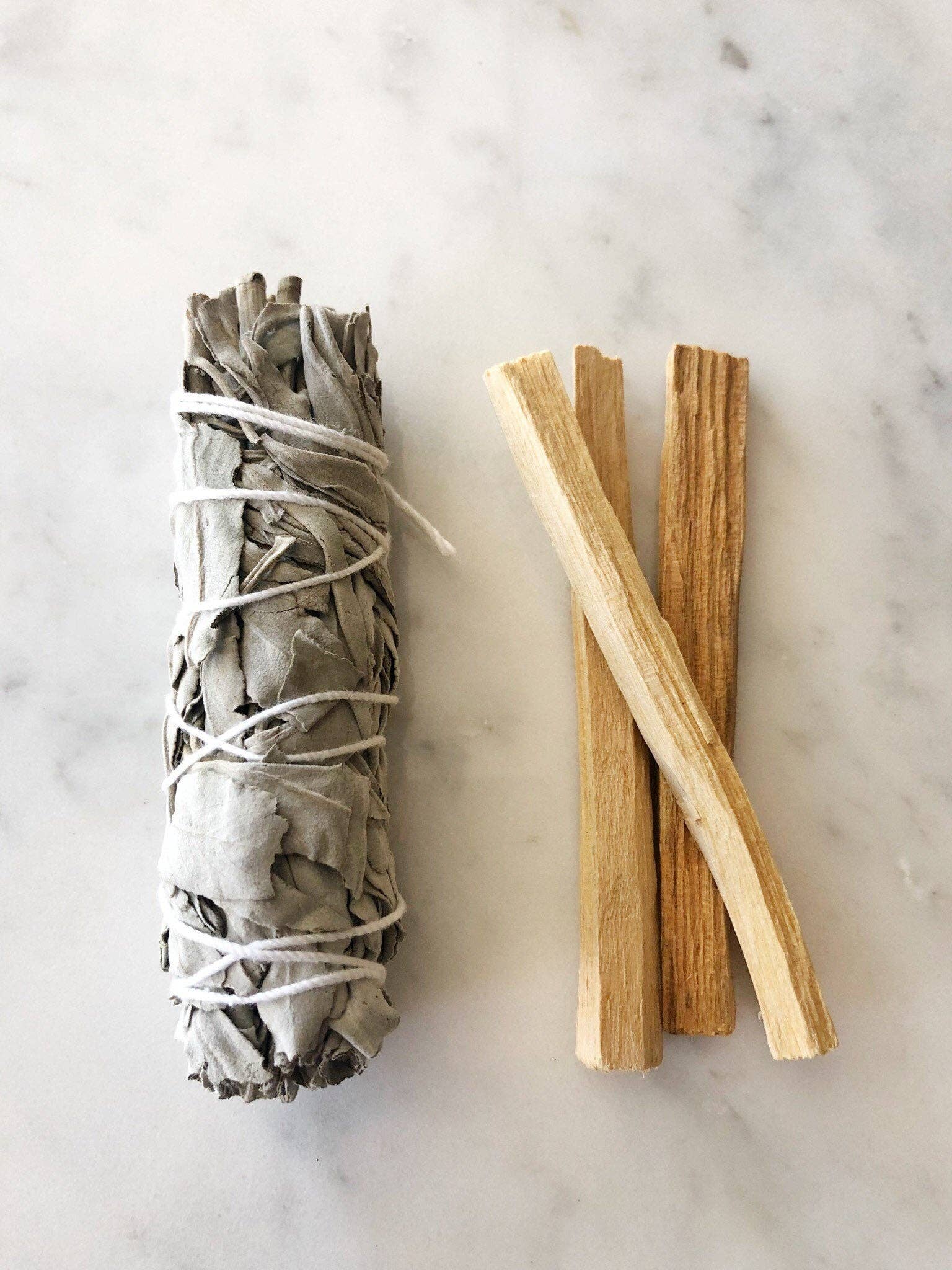 cleanse your space, body and mind 3 x palo santo sticks from fallen bursar graveolens trees, which are not endangered. 1 x sustainably sourced sage -3” stick packaged in a stamped muslin bag how to use: palo santo - hold a piece of the wood slightly upside down and light the tip until there is a small flame. after about 1 minute, blow it out so only smoke is produced. keep blowing on the ember end to release more smoke. sage: light your sage stick over your flameproof bowl until a small flame has caught. while holding your sage over the bowl lightly blow on the flame until it goes out. the sage will then smoke gently like incense.
